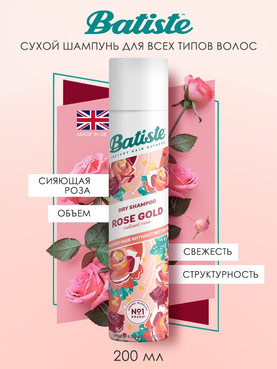 Batiste Rose Gold - сухой шампунь для волос с богатым ароматом, для быстрого придания свежести, объема и структурности. Его действие аналогично обычному шампуню, а ноты розы, бергамота и ванили создают ощущение роскоши. Спрей подойдет для всех типов волос – натуральных, окрашенных, коротких или длинных, седых, осветленных, сухих, жирных, тонких или вьющихся, поврежденных и ослабленных.