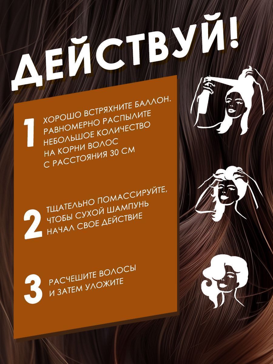 Хорошо встряхните баллон. Равномерно распылите небольшое количество на корни волос с расстояния 30 см. Подождите 3 минуты, тщательно помассируйте, чтобы шампунь начал действовать. Расчешите волосы и затем уложите.