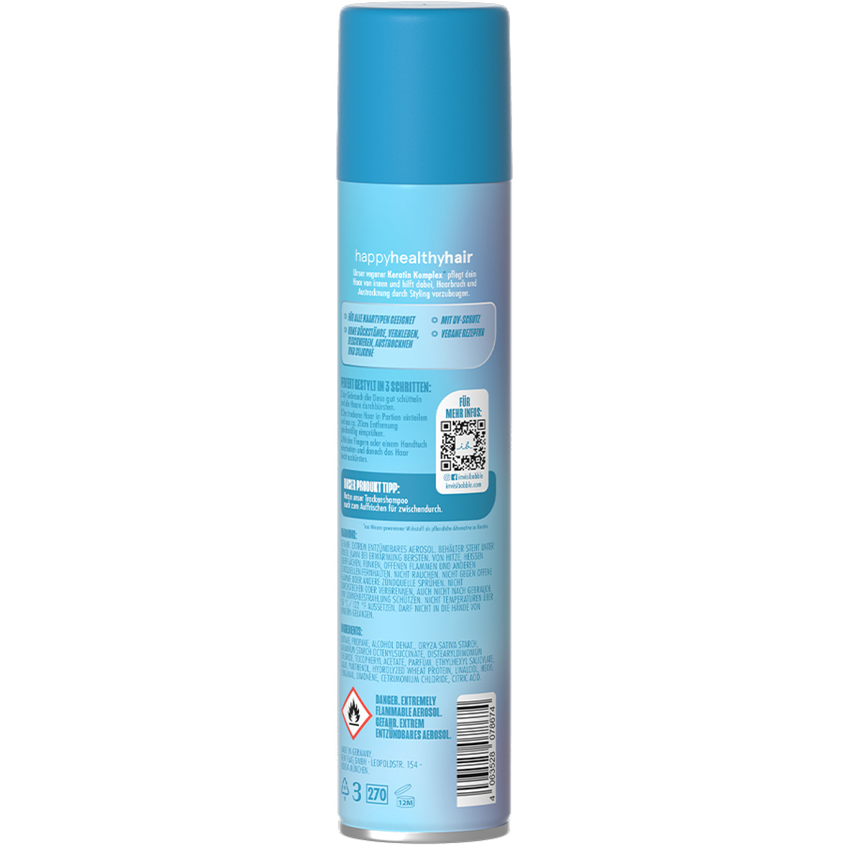 Состав: butane, propane, alcohol denat., oryza sativa starch, aluminum starch octenylsuccinate, distearyldimonium chloride, tocopheryl acetate, parfum, ethylhexyl salicylate, aqua, panthenol, hydrolyzed wheat protein, linalool, hexyl cinnamal, limonene, cetrimonium chloride, citric acid.