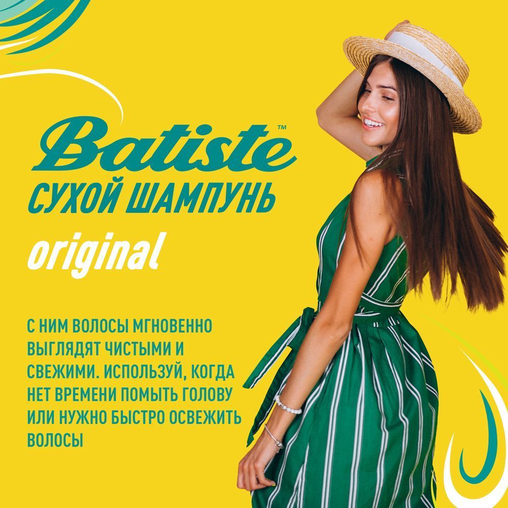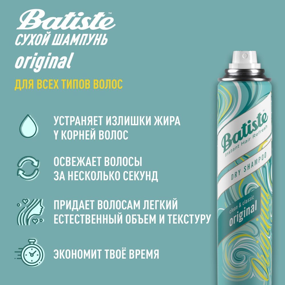 Batiste – отличное средство для активных женщин! Сухой шампунь Batiste устраняет жирность корней, придавая скучным и безжизненным волосам необходимый блеск, без использования воды. Быстро освежает и повышает силу волос, придает телу волоса и текстуру и оставляет ощущение чистоты и свежести. Шампунь Batiste Original сухой - классический (без отдушки), идеален для использования, когда у вас нет времени мыть голову обычным шампунем, когда у вас много других дел, когда ваша жизнь – сплошной круговорот событий. Сухой шампунь быстро и эффективно абсорбирует грязь и жир, тем самым очищая волосы.