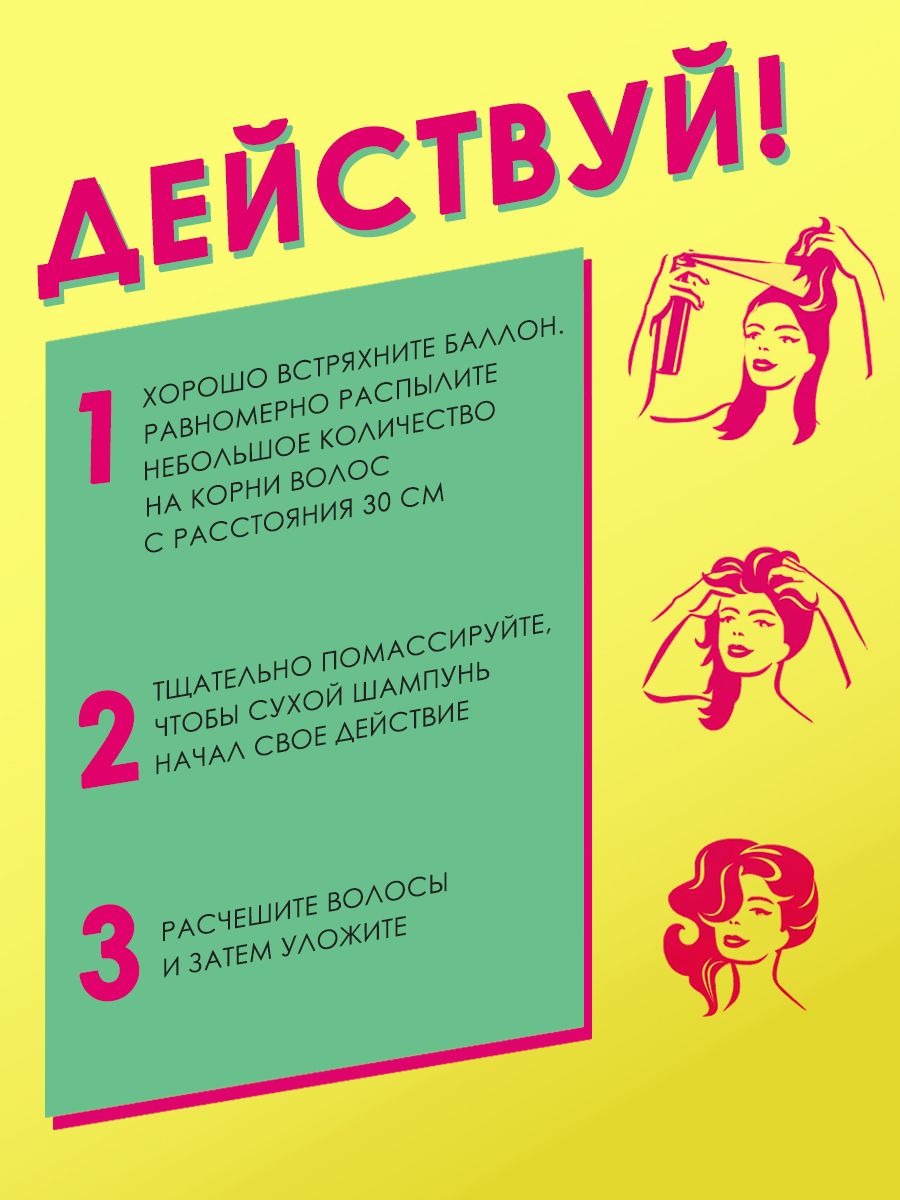 Хорошо встряхните баллон. Равномерно распылите небольшое количество на корни волос с расстояния 30 см. Подождите 3 минуты, тщательно помассируйте, чтобы шампунь начал действовать. Расчешите волосы и затем уложите.