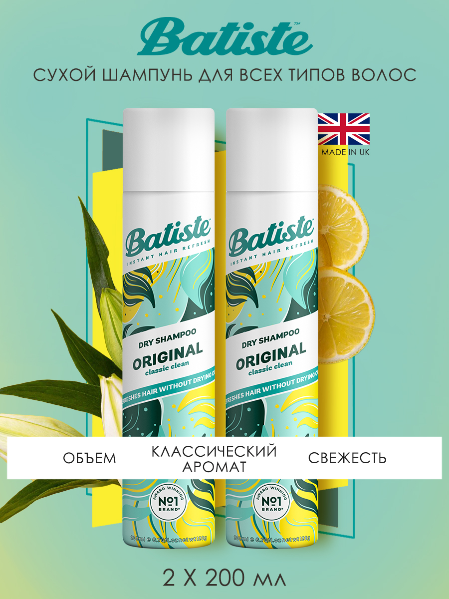 Batiste Original - сухой шампунь для волос с классическим ароматом, для быстрого придания свежести, объема и структурности. Его действие аналогично обычному шампуню, а чудесный аромат сохраняется надолго. Основные ноты апельсин, лилия и мускус. Спрей подойдет для всех типов волос – натуральных, окрашенных, коротких или длинных, седых, осветленных, сухих, жирных, тонких или вьющихся, поврежденных и ослабленных.