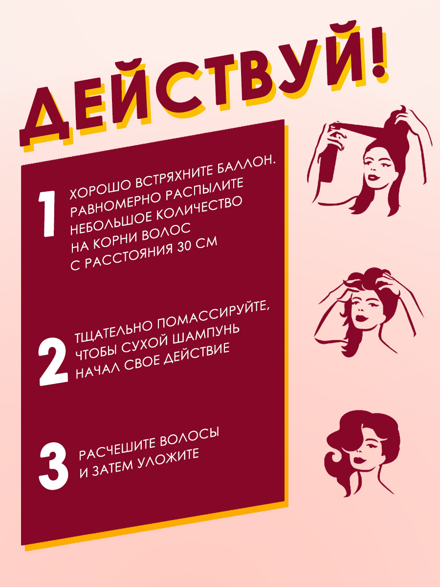 Хорошо встряхните баллон. Равномерно распылите небольшое количество на корни волос с расстояния 30 см. Подождите 3 минуты, тщательно помассируйте, чтобы шампунь начал действовать. Расчешите волосы и затем уложите.