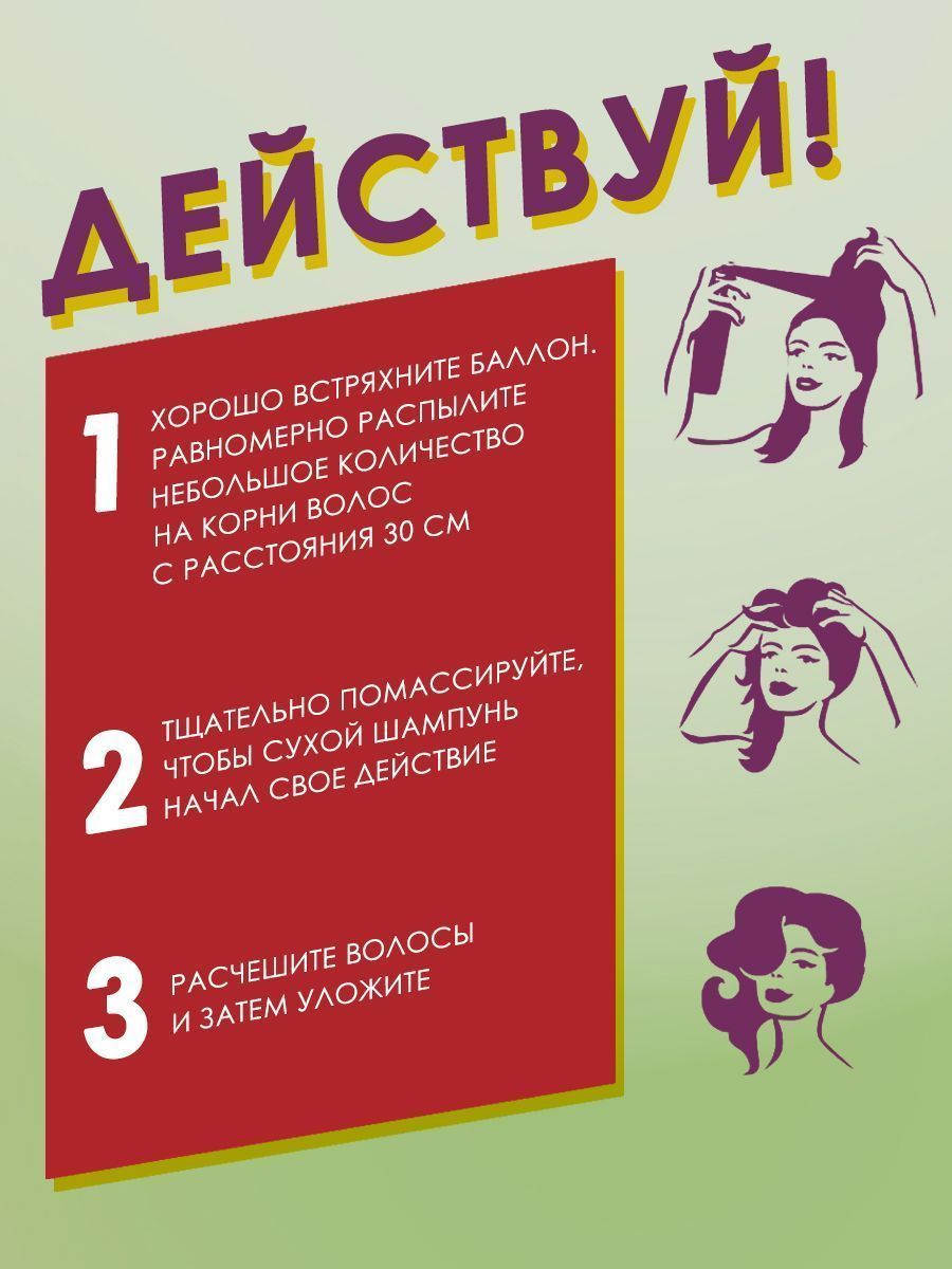 Хорошо встряхните баллон. Равномерно распылите небольшое количество на корни волос с расстояния 30 см. Подождите 3 минуты, тщательно помассируйте, чтобы шампунь начал действовать. Расчешите волосы и затем уложите.