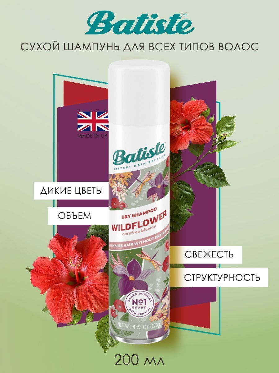 Batiste Wildflower - сухой шампунь для волос с ароматом волшебных диких цветов, предназначенный для быстрого придания свежести, объема и структурности. Его действие аналогично обычному шампуню, а фруктовый микс с цветочным сердцем придает современный изысканный аромат, волосы выглядят и пахнут божественно. Спрей подойдет для всех типов волос – натуральных, окрашенных, коротких или длинных, седых, осветленных, сухих, жирных, тонких или вьющихся.