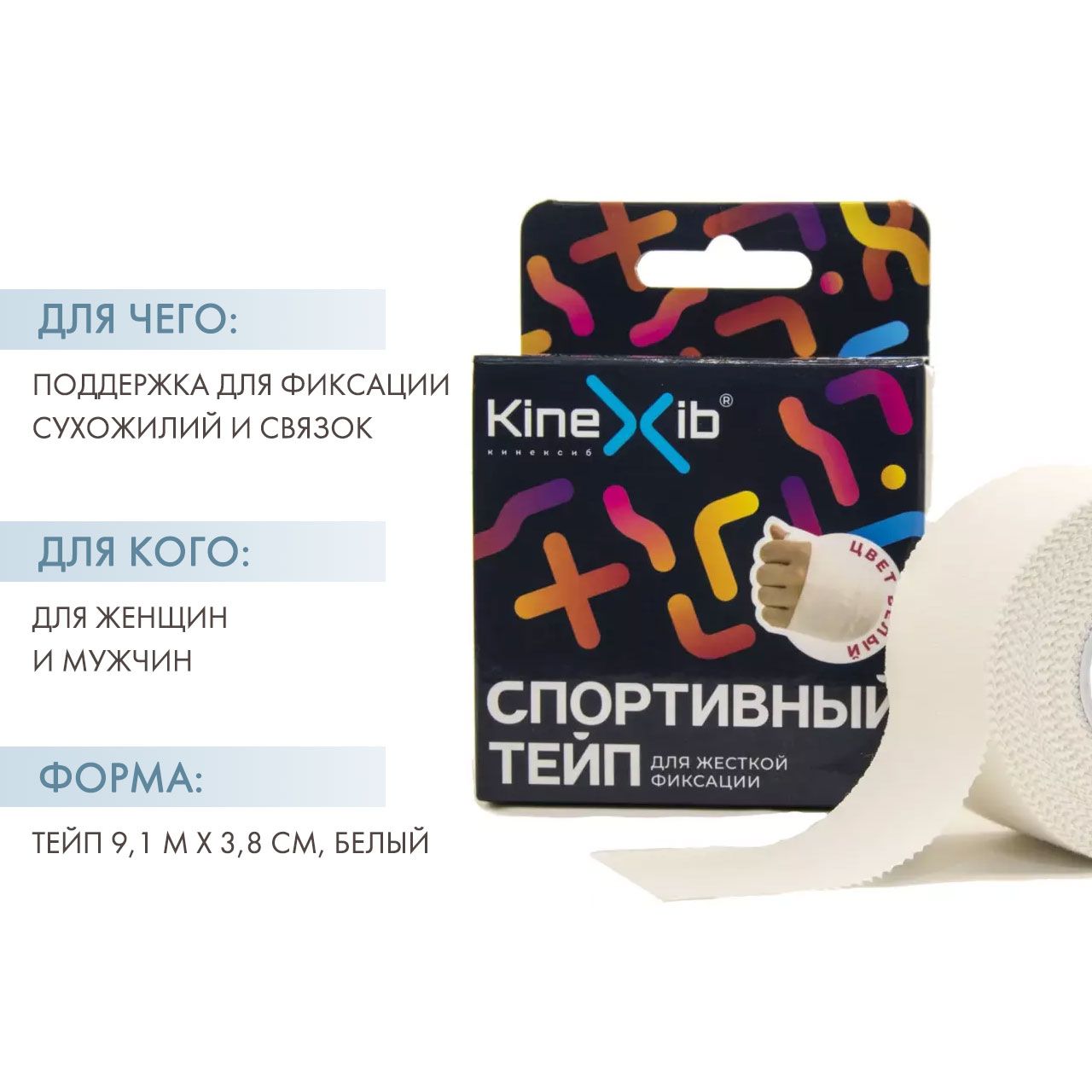 Спортивный тейп Kinexib представляет собой ленты из плотного хлопка и гипоаллергенного клея на акриловой основе, не эластичен. Применяется для жесткой фиксации суставов, связок и элементов снаряжения. Обеспечивает компрессию на длительное время. Отрывается без ножниц, быстро приклеивается и легко снимается. Успешно заменяет бандаж. Поставляется в виде рулона на втулке в индивидуальной картонной коробке. На обороте инструкция по использованию.