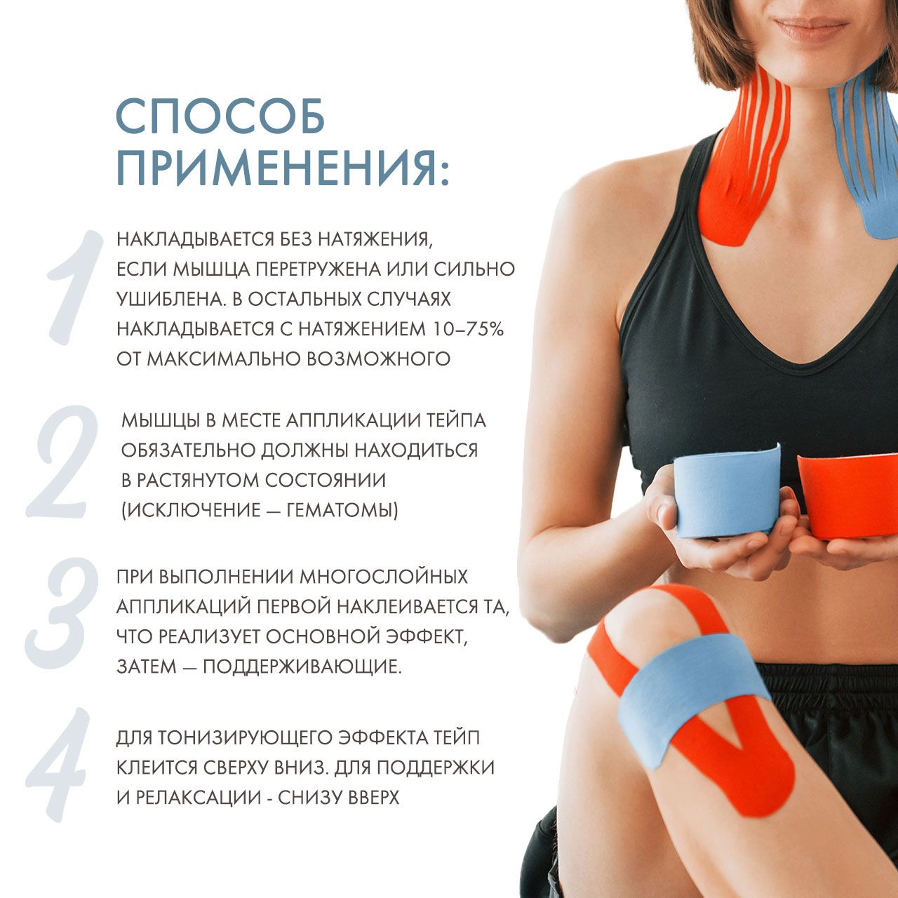 Для тонизирующего эффекта теи?п клеится сверху вниз. Для поддерживающего и релаксирующего эффектов - снизу вверх.