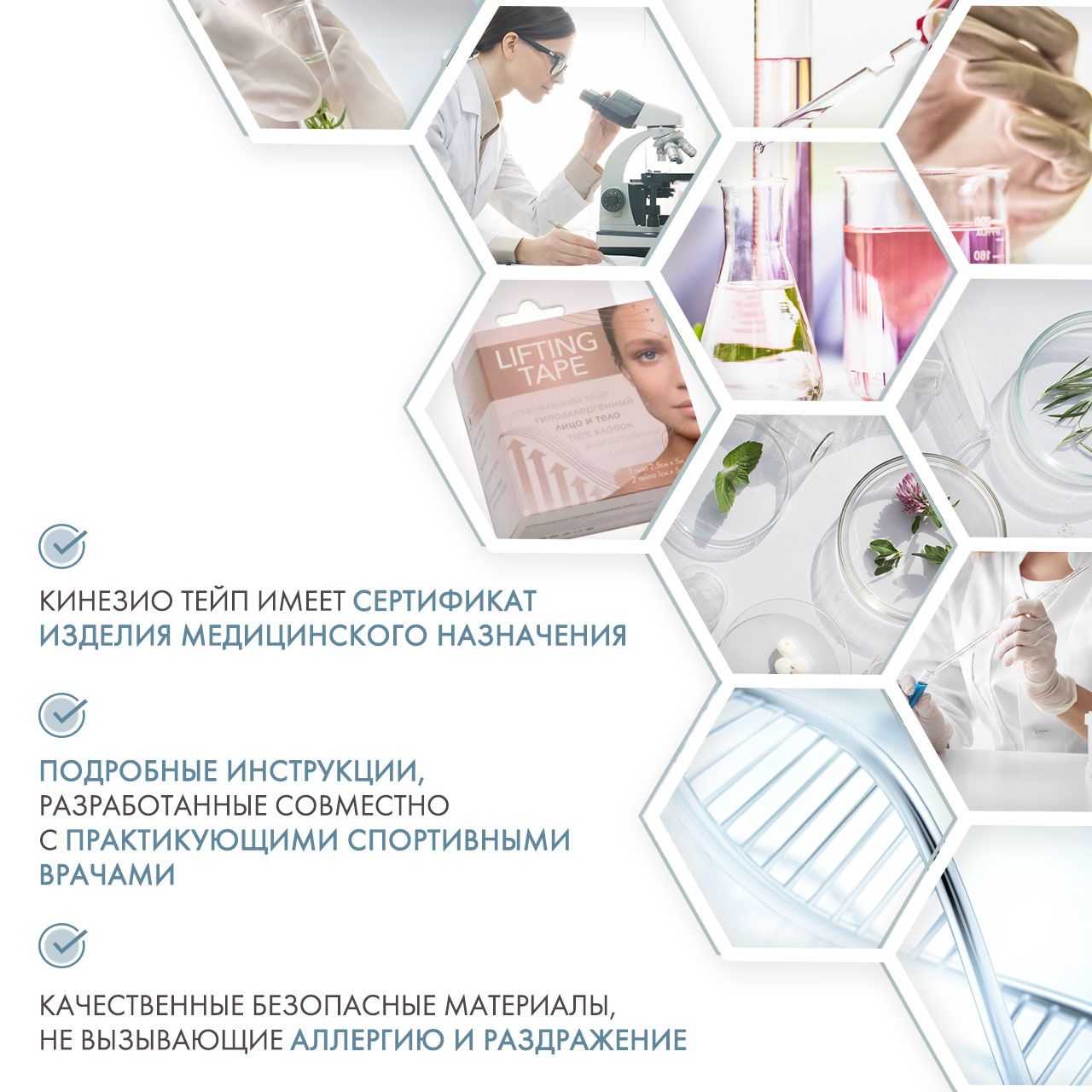 Базовый мягкий и эластичный кинезио тейп удобен и прост в использовании, не препятствует движению. Показаниями к применению являются мимические морщины, отеки и мещки под глазами, второй подбородок.