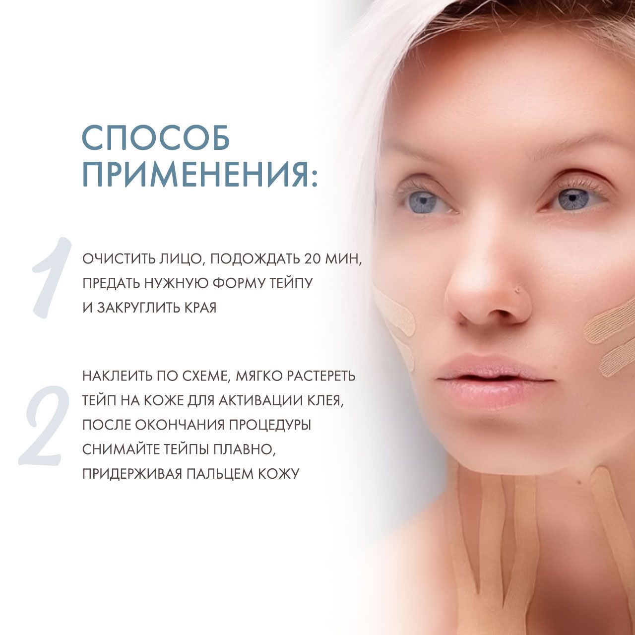 Очистить лицо, подождать 20 мим, предать нужную форму тейпу и закруглить края, наклеить по схеме, мягко растереть тейп на коже для активации клея, после окончания процедуры снимайте тейпы плавно, придерживая пальцем кожу.