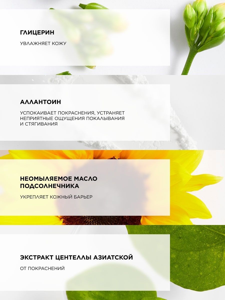 - неомыляемое масло подсолнечника – ингредиент природного происхождения, концентрация активных молекул в 10 раз выше, чем в обычном подсолнечном масле