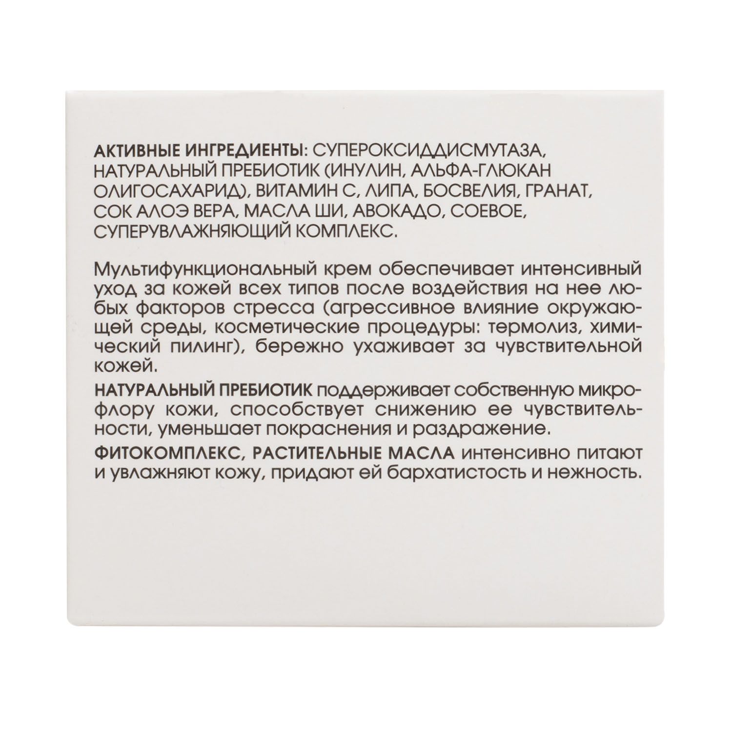 Мультифункциональный крем обеспечивает интенсивный уход за кожей после воздействия на нее любых факторов стресса (агрессивное влияние окружающей среды: холод, ветер, пыль, солнечные ожоги, а также косметические процедуры: термолиз, химический пилинг и др.). Подходит для кожи любого типа, включая чувствительную и раздраженную.