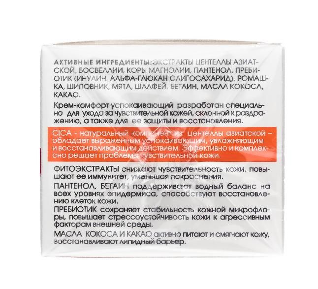 Крем-комфорт успокаивающий разработан специально для ухода за чувствительной кожей, склонной к раздражению, а также для её защиты и восстановления. Способствует интенсивному восстановлению защитного барьера, снижению чувствительности, повышению иммунитета кожи. Увлажняет, питает и смягчает кожу, выравнивает ее тон, дарит ощущение комфорта.