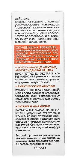 Концентрированная сыворотка активного действия обладает мощным успокаивающим эффектом. Способствует восстановлению барьерной функции и оказывает антиоксидантное действие. Устраняет дискомфортные ощущения кожи (покраснение, раздражение, пощипывание, стянутость), обусловленных гиперчувствительностью. Питает, увлажняет кожу, придает ей нежность и сияние.