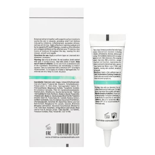 Крем мгновенно успокаивает раздраженную кожу, уменьшает воспаление, сухость, жирность, покраснение и зуд. Комбинация высокоэффективных компонентов корректирует эти нежелательные симптомы, улучшая защиту ДНК, функции клеток, помогая регенерации межклеточных липидов верхнего слоя кожи, также уменьшает трансэпидермальную потерю воды, защищая кожу от внешних и внутренних стрессовых воздействий. Кожа успокаивается, разглаживается и приобретает эластичность.