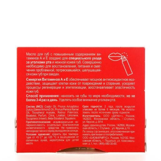 Масло с повышенным содержанием витаминов А и Е создано для специального ухода за нежной кожей губ.