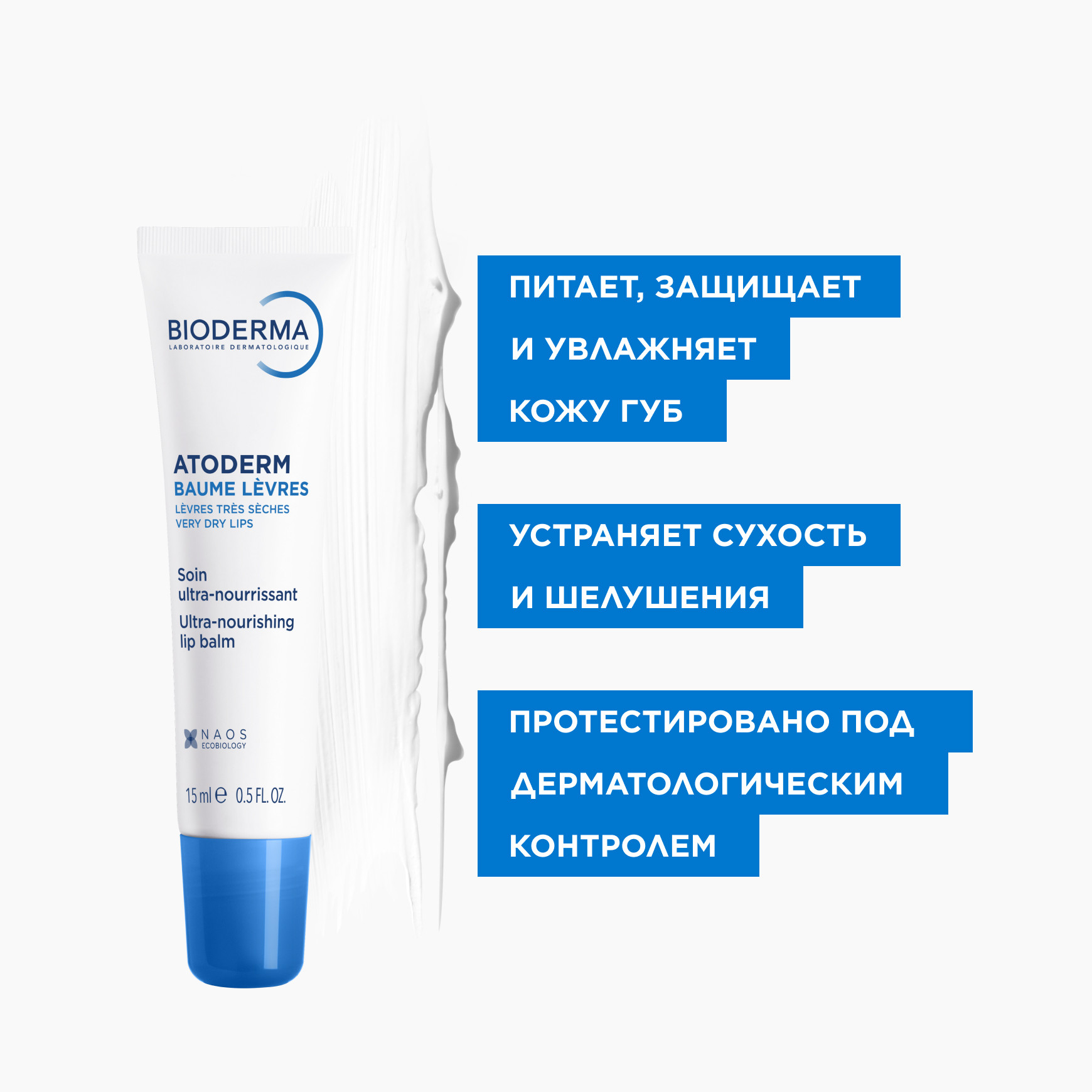 Насыщенная текстура обеспечивает комфорт и делает кожу губ мягкой. Без отдушки. Высокая переносимость.