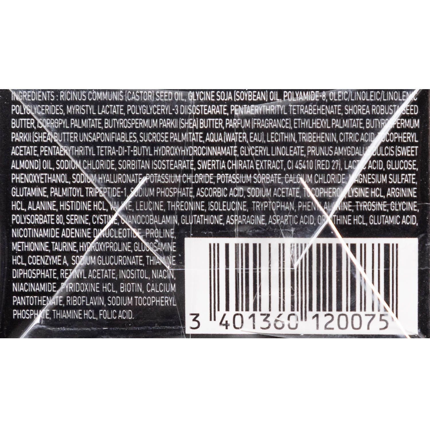 Состав: ricinus communis (castor) seed oil, glycine soja (soybean) oil, polyamide-8, oleic/linoleic/linolenic polyglycerides, myristyl lactate, polyglyceryl-3 diisostearate, pentaerythrityl tetrabehenate, shorea robusta seed butter, isopropyl palmitate, butyrospermum parkii (shea) butter, parfum (fragrance), ethylhexyl palmitate, butyrospermum parkii (shea) butter unsaponifiables, sucrose palmitate, aqua (water, eau), lecithin, tribehenin, citric acid, tocopheryl acetate, pentaerythrityl tetra-di-t-butyl hydroxyhydrocinnamate, glyceryl linoleate, prunus amygdalus dulcis (sweet almond) oil, sodium chloride, sorbitan isostearate, swertia chirata extract, ci 45410 (red 27), lactic acid, glucose, phenoxyethanol, sodium hyaluronate, potassium chloride, potassium sorbate, calcium chloride, magnesium sulfate, glutamine, palmitoyl tripeptide-1, sodium phosphate, ascorbic acid, sodium acetate, tocopherol, lysine hcl, arginine hcl, alanine, histidine hcl, valine, leucine, threonine, isoleucine, tryptophan, phenylalanine, tyrosine, glycine, polysorbate 80, serine, cystine, cyanocobalamin, glutathione, asparagine, aspartic acid, ornithine hcl, glutamic acid, nicotinamide adenine dinucleotide, proline, methionine, taurine, hydroxyproline, glucosamine hcl, coenzyme a, sodium glucuronate, thiamine diphosphate, retinyl acetate, inositol, niacin, niacinamide, pyridoxine hcl, biotin, calcium pantothenate, riboflavin, sodium tocopheryl phosphate, thiamine hcl, folic acid.