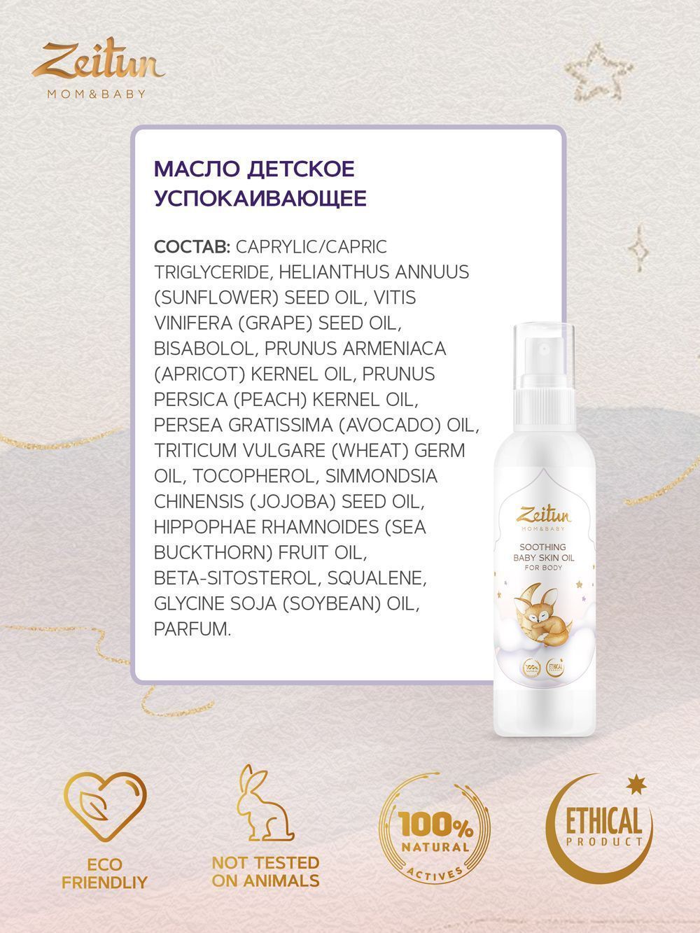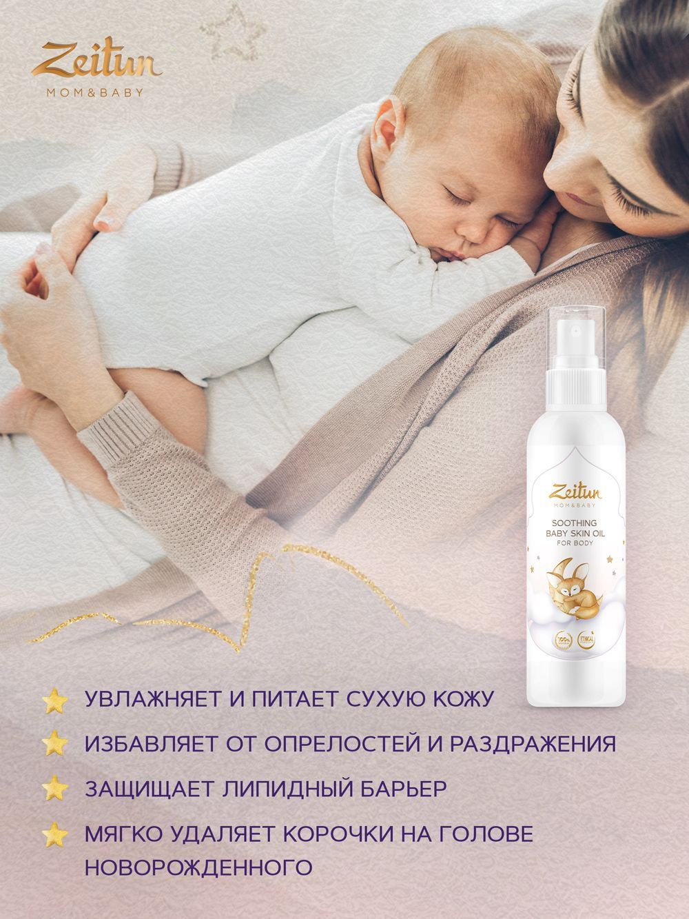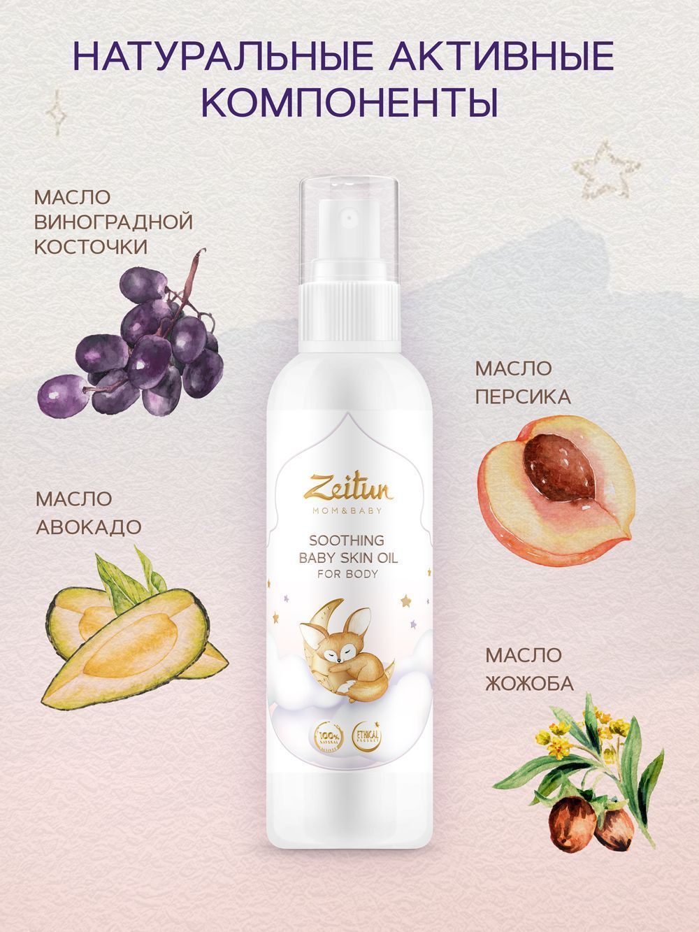 Доверьте заботу о коже малыша природе с Zeitun Mom&Baby. Натуральная смесь драгоценных масел виноградной косточки, авокадо, персика и жожоба увлажняет, питает и успокаивает чувствительную детскую кожу, помогает снять симптомы опрелостей и раздражения, способствует мягкому удалению корочек на голове новорожденного. Чистые масла богаты витаминами, необходимыми жирными кислотами и микроэлементами, которые с первых дней формируют здоровую кожу вашего малыша. Идеально для детского массажа.