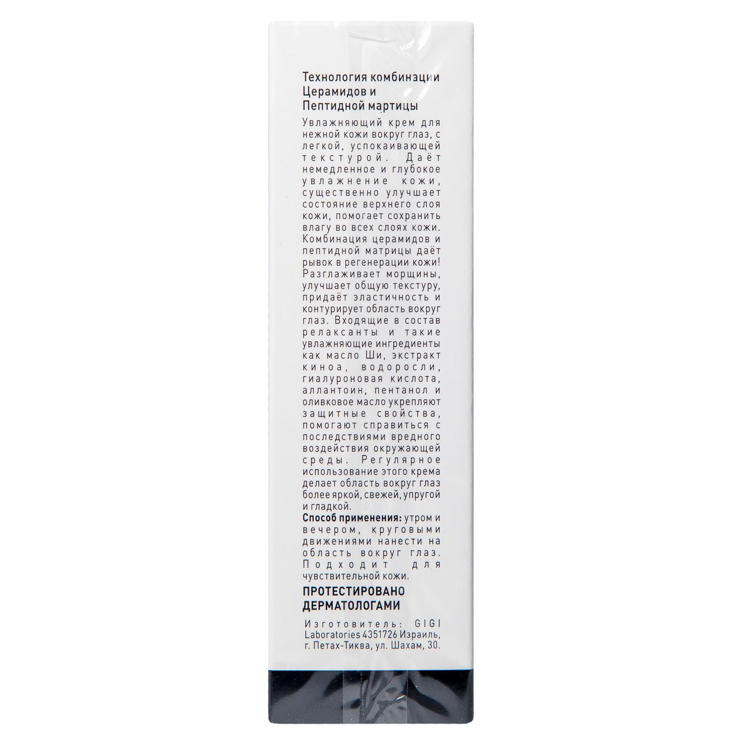 • способствует уменьшению сухости, улучшению текстуры, эластичности и упругости кожи в области вокруг глаз