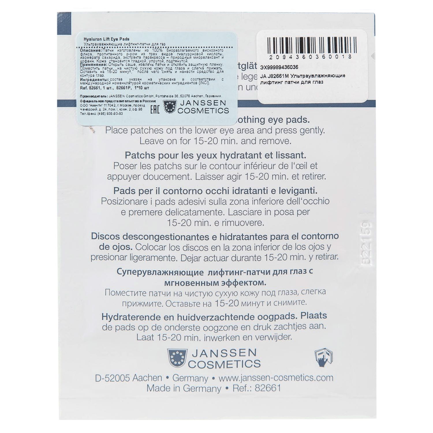 Hyaluron Lift Eye Pads - это интенсивно увлажняющие и разглаживающие кожу патчи для век с мгновенным эффектом, обогащенные 3-кратной гиалуроновой кислотой и паракрессом.