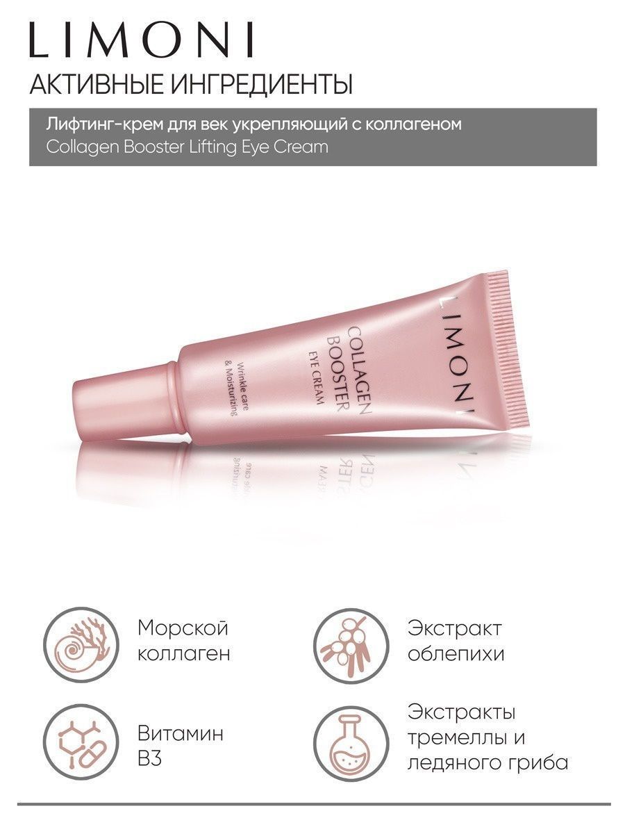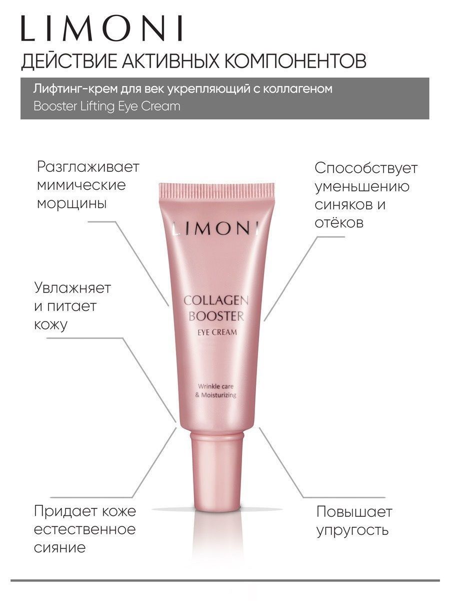 Крем для век Сollagen Booster Firming Eye Cream содержит до 42% морского коллагена. Благодаря высокому содержанию коллагена крем подтягивает и разглаживает кожу вокруг глаз, устраняет мимические морщины, отеки, темные круги под глазами, повышает упругость кожи, избавляет от следов усталости и стресса.
