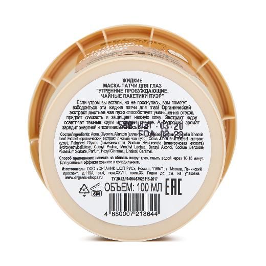 Если утром вы встали, но не проснулись, вам помогут взбодриться эти жидкие патчи для глаз! Органический экстракт листьев чая пуэр способствует уменьшению отеков, придает свежесть и защищает нежную кожу. Экстракт юдзу осветляет темные круги и придает сияние. А бодрящий аромат зарядит энергией и позитивом на весь день!