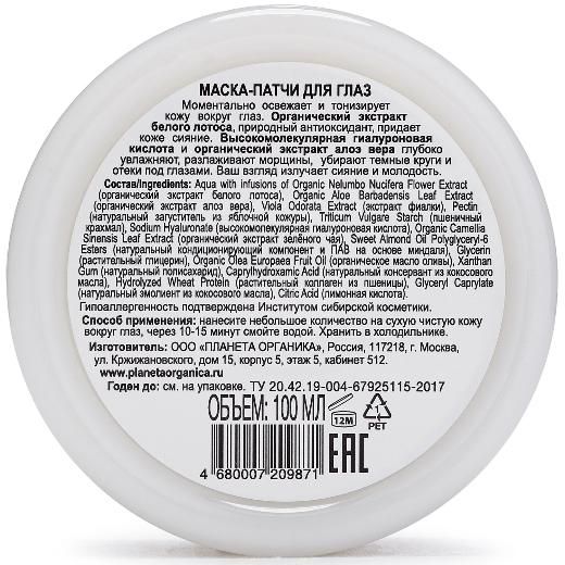 Маска-патчи для глаз моментально освежает и тонизирует кожу вокруг глаз. Органический экстракт белого лотоса, природный антиоксидант, придает коже сияние. Высокомолекулярная гиалуроновая кислота и органический экстракт алоэ вера глубоко увлажняют, разлаживают морщины, убирают темные круги и отеки под глазами. Ваш взгляд излучает сияние и молодость.