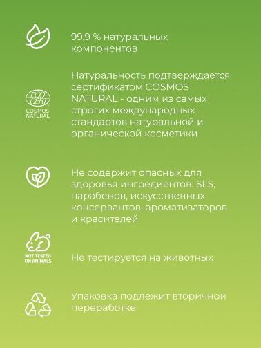 Создано из природных компонентов высокого качества. Не содержит SLS, парабенов, искусственных консервантов, ароматизаторов и красителей.