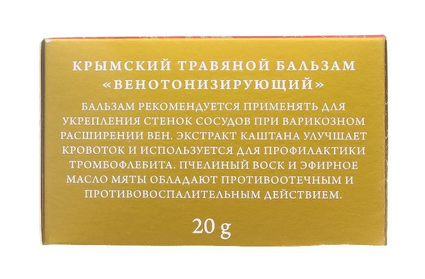 Бальзам рекомендуется применять для укрепления стенок сосудов при варикозном расширении вен. Экстракт каштана улучшает кровоток и используется для профилактики тромбофлебита. Пчелиный воск и эфирное масло мяты обладают противоотечным и противовоспалительным действием.