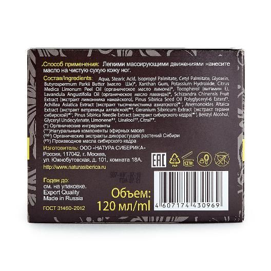 Лимонник китайский, известный своими тонизирующими свойствами, повышает защитные функции кожи, стимулирует обмен веществ. Кедровое масло, в котором содержится большое количество жирных кислот и антиоксидантов, оказывает омолаживающее воздействие на кожу и повышает ее упругость. Эфирное масло лаванды обладает регенерирующими свойствами, способствует заживлению микротрещин, мозолей и других повреждений кожи. После применения сибирского масла Natura Siberica кожа ног становится гладкой, мягкой и нежной.