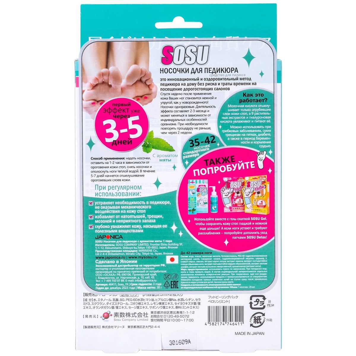 Носочки “SOSU” позволяют сделать педикюр дома самостоятельно, не хуже профессионального, не затрачивая лишние время и деньги. Процедура с помощью носочков эффективна и абсолютно безопасна, не требует механической обработки, поскольку основана на Молочной кислоте, образующейся при молочнокислом брожении сахаров, в частности в прокисшем молоке, она не затрагивает здоровую кожу, размягчает ороговевшие ткани и удаляет только омертвевшие участки кожи. Кроме того, в состав включены сильный увлажняющий комплекс и множество оздоравливающих натуральных растительных компонентов, обладающих противогрибковым и лечебным эффектом. В результате, трещины, мозоли и натоптыши исчезают в течение недели, и кожа стоп становится нежной, гладкой и упругой.