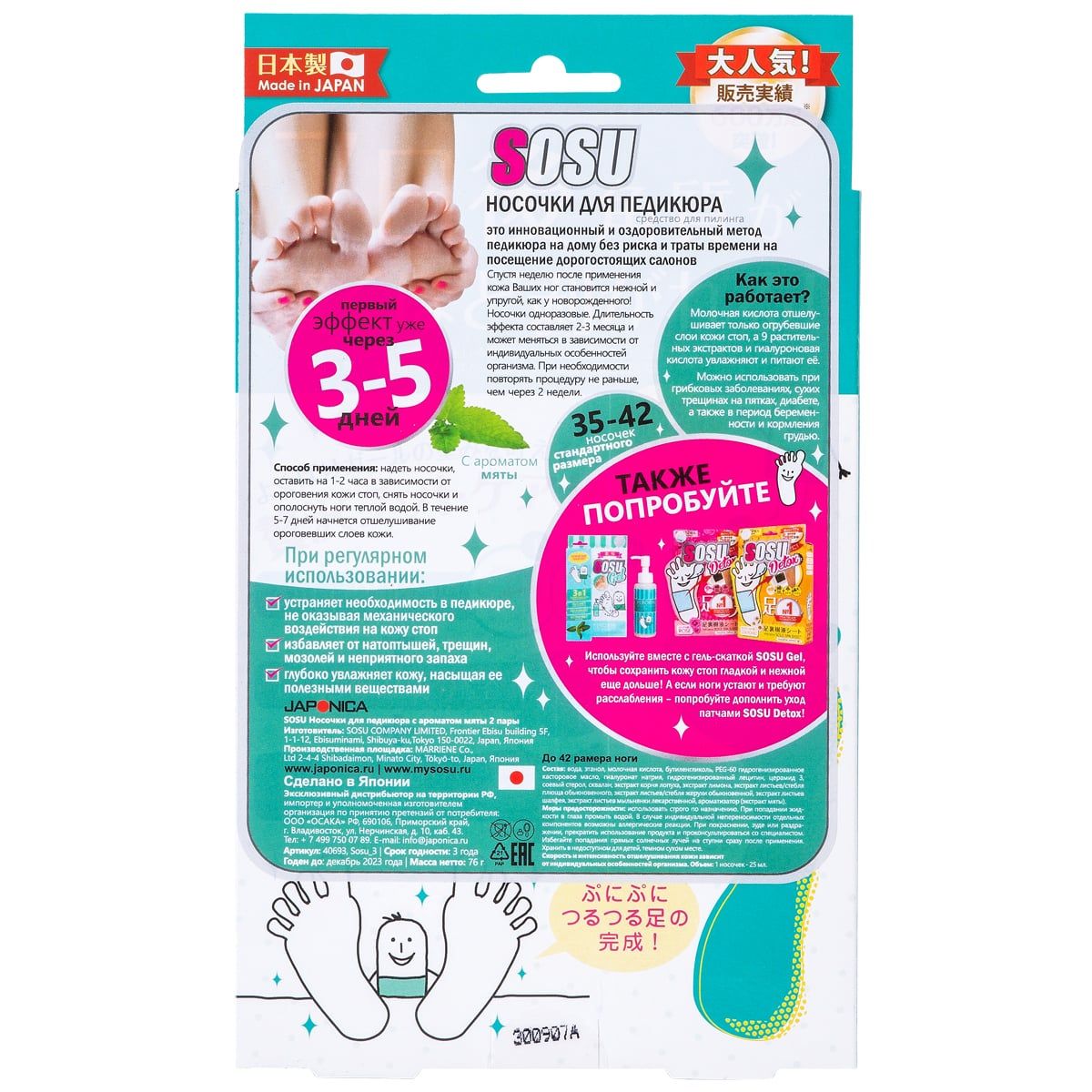 Носочки “SOSU” позволяют сделать педикюр дома самостоятельно, не хуже профессионального, не затрачивая лишние время и деньги. Процедура с помощью носочков эффективна и абсолютно безопасна, не требует механической обработки, поскольку основана на Молочной кислоте, образующейся при молочнокислом брожении сахаров, в частности в прокисшем молоке, она не затрагивает здоровую кожу, размягчает ороговевшие ткани и удаляет только омертвевшие участки кожи. Кроме того, в состав включены сильный увлажняющий комплекс и множество оздоравливающих натуральных растительных компонентов, обладающих противогрибковым и лечебным эффектом. В результате, трещины, мозоли и натоптыши исчезают в течение недели, и кожа стоп становится нежной, гладкой и упругой.