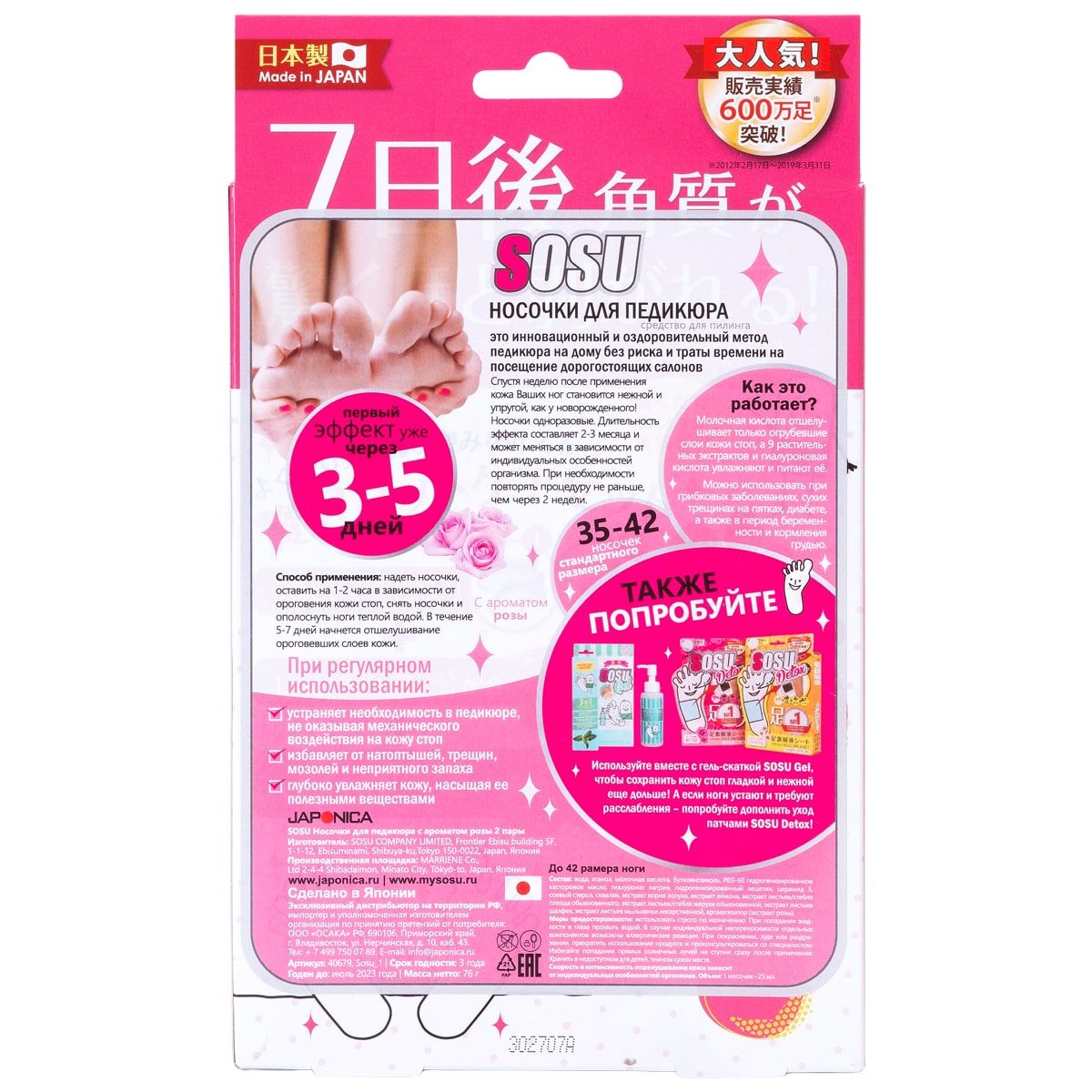 Носочки “SOSU” позволяют сделать педикюр дома самостоятельно, не хуже профессионального, не затрачивая лишние время и деньги. Процедура с помощью носочков эффективна и абсолютно безопасна, не требует механической обработки, поскольку основана на Молочной кислоте, образующейся при молочнокислом брожении сахаров, в частности в прокисшем молоке, она не затрагивает здоровую кожу, размягчает ороговевшие ткани и удаляет только омертвевшие участки кожи. Кроме того, в состав включены сильный увлажняющий комплекс и множество оздоравливающих натуральных растительных компонентов, обладающих противогрибковым и лечебным эффектом. В результате, трещины, мозоли и натоптыши исчезают в течение недели, и кожа стоп становится нежной, гладкой и упругой.