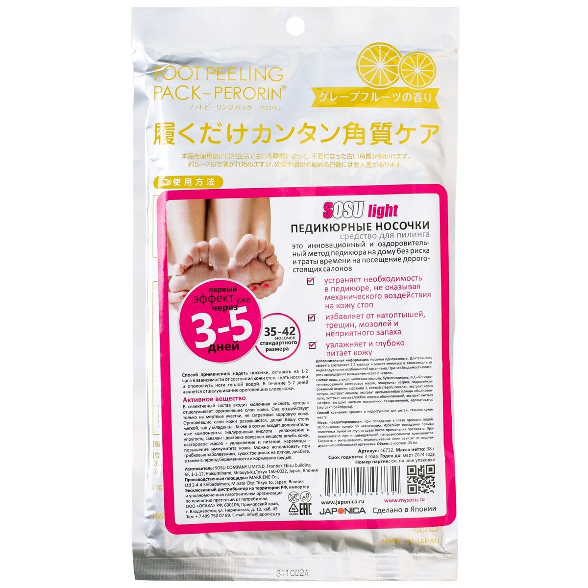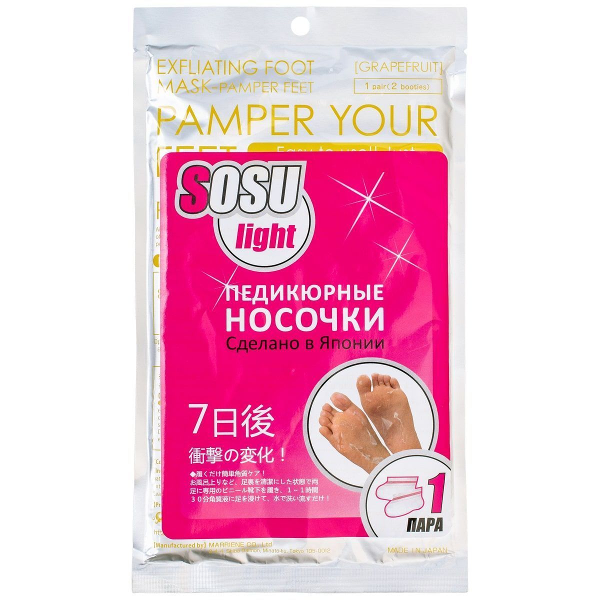 Носочки «SOSU» - это инновационный способ педикюра на дому без риска и траты времени на посещение дорогостоящих процедур. «SOSU» – новое слово в косметологии, разработанное японскими специалистами, которое уже по достоинству оценили женщины страны «Восходящего Солнца», вверив самой природе заботу о своих ножках. Основной компонент активного вещества - молочная кислота и растительные экстракты лопуха, лимона, плюща, жерухи, шалфея, мыльнянки и др., стимулирующие естественный процесс отторжения мертвых тканей. Оказывают терапевтическое и эстетическое действие, быстро и безопасно решают косметологические проблемы стоп. Первый эффект заметен через 3-5 дней. Спустя две недели после применения кожа становится гладкой и упругой, сохраняя эффект в течение долгого времени. Противогрибковый эффект. Устранение трещин, потертостей и мозолей. Противоотечное и противовоспалительное действие. Улучшение эстетических качеств кожи ступни.