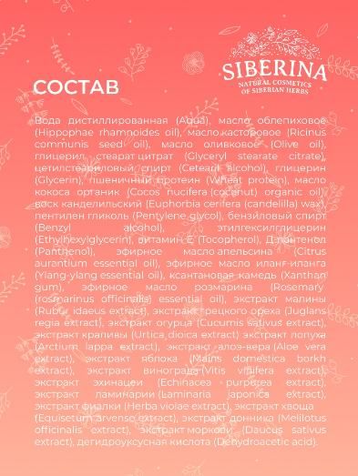 Состав: вода дистиллированная (aqua), масло облепиховое (hippophae rhamnoides оil), масло касторовое (ricinus communis seed oil), масло оливковое (olive oil), глицерил стеарат цитрат (glyceryl stearate citrate), цетилстеариловый спирт (cetearil alcohol), глицерин (glycerin), пшеничный протеин (wheat protein), масло кокоса органик (cocos nucifera (coconut) organic oil), воск канделильский (euphorbia cerifera (candelilla) wax), пентилен гликоль (pentylene glycol), бензиловый спирт (benzyl alcohol), этилгексилглицерин (ethylhexylglycerin), витамин е (tocopherol), д-пантенол (panthenol), эфирное масло апельсина (citrus aurantium essential oil), эфирное масло иланг-иланга (ylang-ylang essential oil), ксантановая камедь (xanthan gum), эфирное масло розмарина (rosemary (rosmarinus officinalis) essential oil), экстракт малины (rubur idaeus extract), экстракт грецкого ореха (juglans regia extract), экстракт огурца (cucumis sativus extract), экстракт крапивы (urtica dioica extract) экстракт лопуха (arctium lappa extract), экстракт алоэ-вера (aloe vera extract), экстракт яблока (mains domestica borkh extract), экстракт винограда (vitis vinifera extract), экстракт эхинацеи (echinacea purpurea extract), экстракт ламинарии (laminaria japonica extract), экстракт фиалки (herba violae extract), экстракт хвоща (equisetum arvense extract), экстракт донника (melilotus officinalis extract), экстракт моркови (daucus sativus extract), дегидроуксусная кислота (dehydroacetic acid)