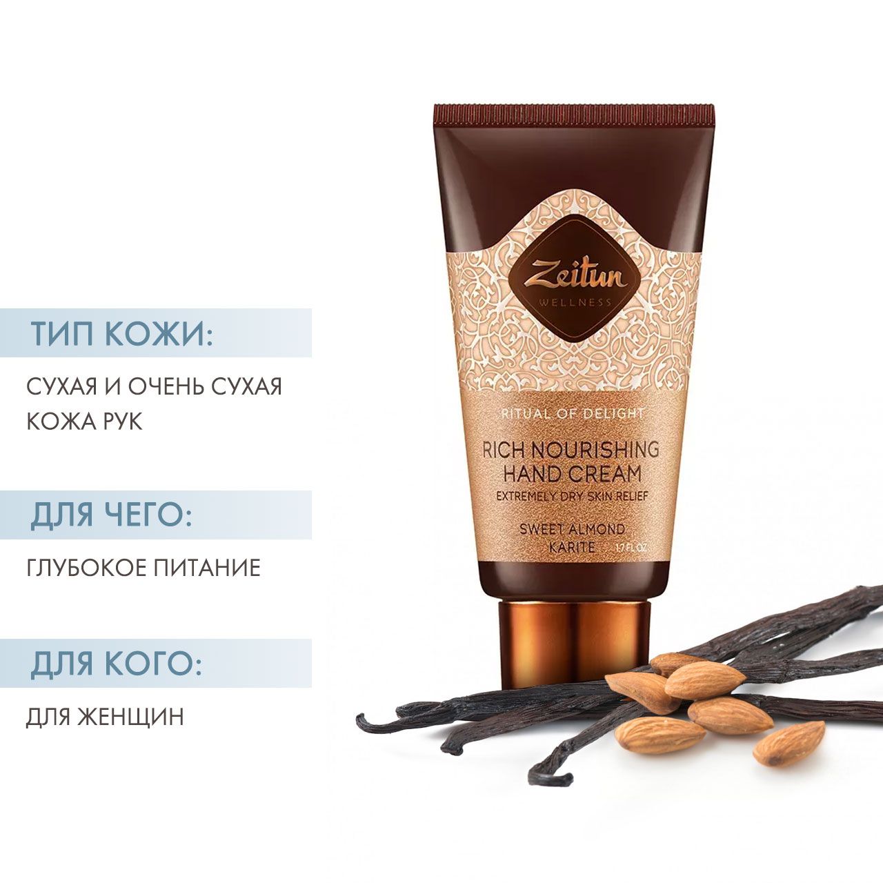 Подарите себе самые сладостные арома-ассоциации, а вашим рукам – желанное наслаждение от ультрапитательного ухода с великолепным ритуалом для красоты рук от Zeitun Wellness. Бережно обрамленная высокоэкологичными современными технологиями, натуральная формула крема содержит высокопитательные масла ши и сладкого миндаля, которые глубоко питают и смягчают сухую кожу, устраняют ощущение стянутости и шелушение, а также нейтрализуют воздействие жесткой водопроводной воды. Восхитительный аромат сладкого миндаля, ванили и бобов тонка дарит самые приятные ощущения от ежедневной ароматерапии.