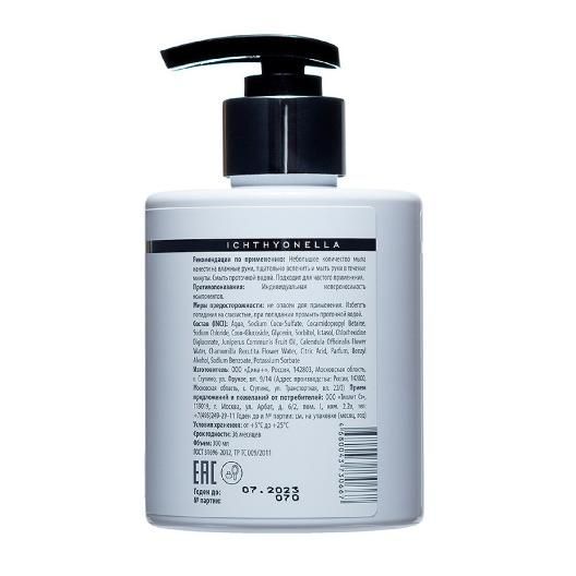 Состав:aqua, sodium coco-sulfate (ПАВ из кокосового/пальмового масла, сертификат ecosert, разрешенный по стандарту Cosmos для производства органической косметики), cocamidopropyl betaine (ПАВ из кокосового масла), sodium chloride (соль пищевая), coco-glucoside (ПАВ из кокосового масла и глюкозы), glycerin (глицерин), sorbitol (сорбитол/увлажнитель), ictasol (ихтиол), chlorhexidine digluconate (хлоргексидина биглюконат), juniperus communis fruit oil (эфирное масло можжевельника), calendula officinalis flower water (гидролат календулы), chamomilla recutita flower water (гидролат ромашки), citric acid (лимонная кислота), parfum (отдушка), benzyl alcohol, sodium benzoate, potassium sorbate (бензиловый спирт, бензоат натрия, калия сорбат/консервант, разрешенный по стандарту Cosmos для производства органической косметики).