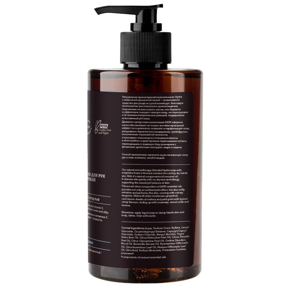 Натуральное жидкое мыло из коллекции Hydra с невесомой ароматной пеной – незаменимое средство для ухода за сухой кожей рук. Благодаря мягкому растительному ПАВ, оно бережно и эффективно очищает кожу, поддерживая ее естественный баланс. Активный компонент – масло рисовых отрубей, богатое линолевой кислотой, скваленом и витамином Е, увлажняет, выравнивает рельеф кожи, придает гладкость. 100% эфирные масла усиливают увлажняющие свойства мыла и наделяют его приятным древесно-цитрусовым ароматом. Мандарин, грейпфрут, мелисса, цитрус наперебой раскрываются умиротворяющей горьковатой прохладой, которая сменяется чистой свежей травянистосью розмарина с отчетливыми мятными нотами. В финале лидирует молочная древесность кедра, уравновешенная томным тягучим ладаном.