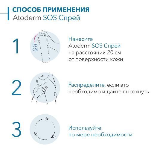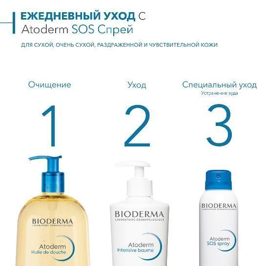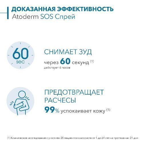 Спрей Bioderma Atoderm SOS устраняет зуд и его симптомы в течение 60 секунд после нанесения и сохраняет ощущение комфорта на протяжении 6 часов. Благодаря мелкодисперсному распылителю эмульсия равномерно распределяется по коже, мгновенно освежая и успокаивая её. Уровень pH соответствует физиологическому, не оставляет следов на одежде. Проведены клинические исследования, рекомендовано дерматологами.