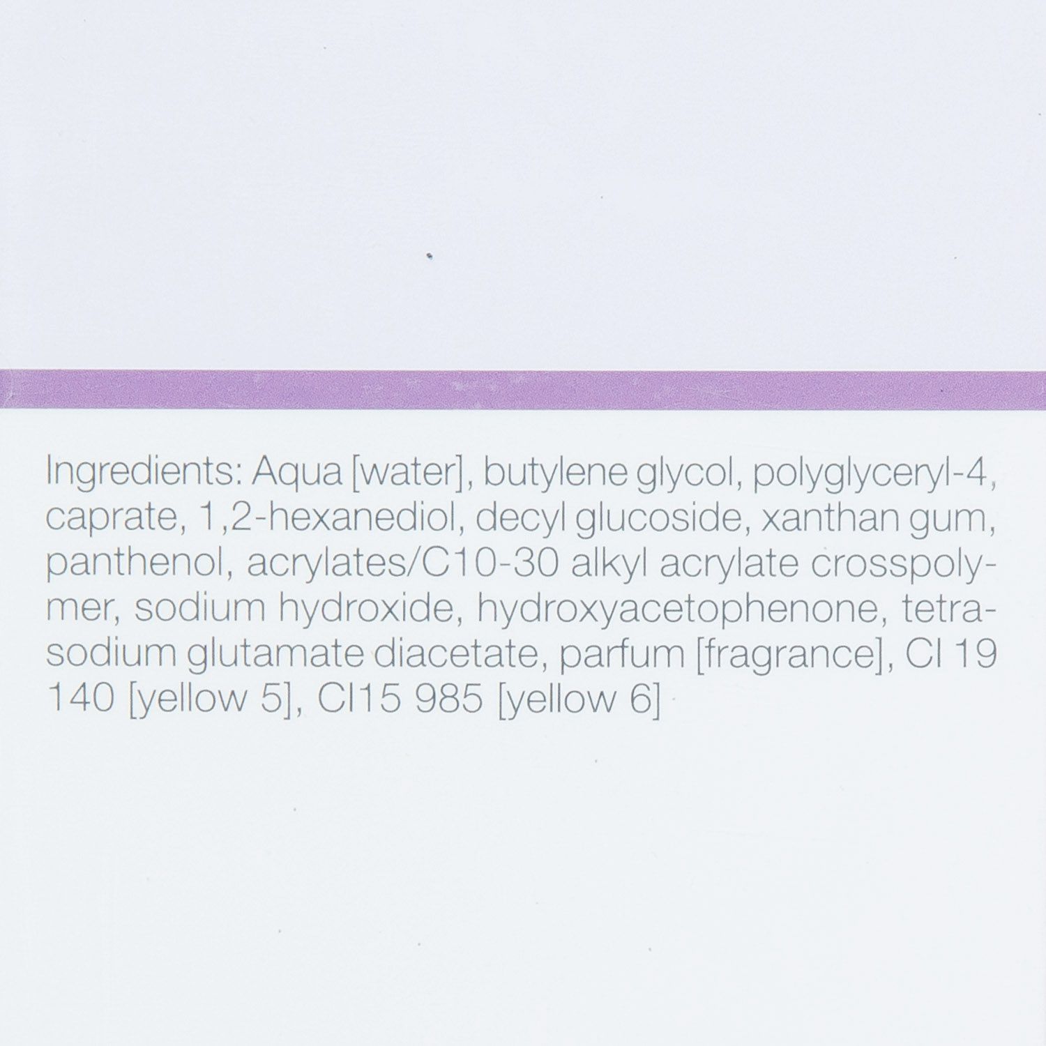 Состав: aqua(water), butylene glycol, polyglyceryl-4 caprate, 1,2-hexanediol, decyl glucoside, xanthan gum, panthenol, acrylates/с10-30 alkyl acrylate crosspolymer, sodium hydroxide, hydroxyacetophenone, tetrasodium glutamate diacetate, parfum (fragrance), ci 19 140 (yellow 5), ci 15 985 (yellow 6)