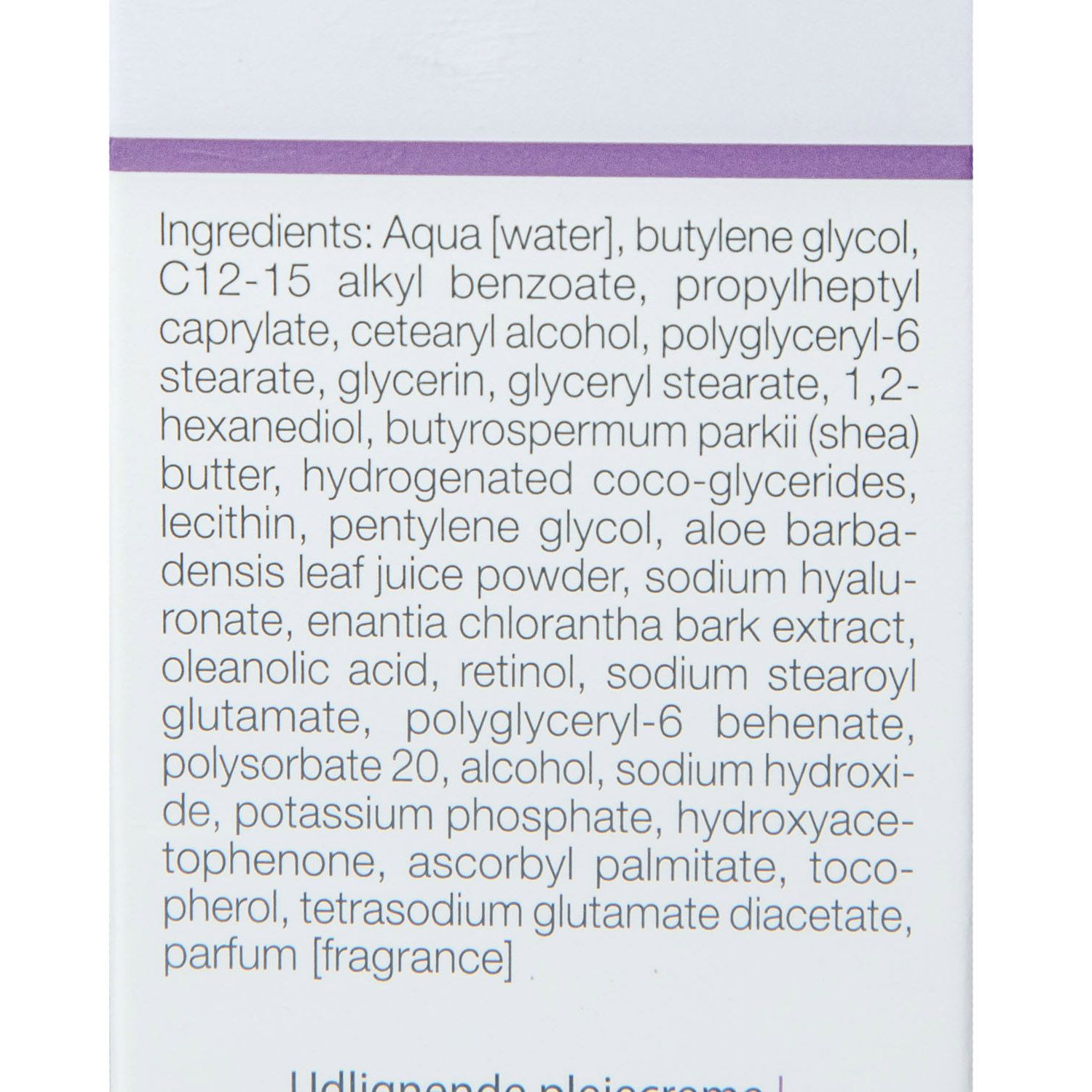 Состав: aqua(water), butylene glycom, c 12-15 alkyl benzoate, propylheptyl caprylate, cetearyl alcohol, polyglyceryl-6 stearate, glycerin, glyceryl stearate, 1,2- hexanediol, butyrospermum parkll (shea) butter, hydrogenated coco-glycerides, lecithin, pentylene glycol, aloe barbadensis leaf juice powder, sodium hyaluronate, enantia chlorantha bark extract, oleanolic acid, retinol, sodium stearoyl glutamate, polyglyceryl-6 behenate, polysorbate 20, alcohol, sodium hydroxide, potassium phosphate, hydroxyacetophenone, ascorbyl palmitate, tocopherol, tetrasodium glutamate diacetate, parfum (fragrance)