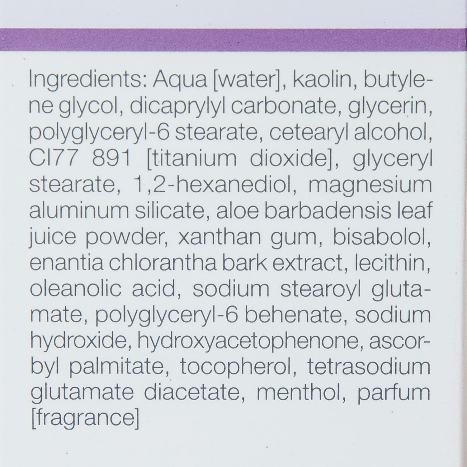 Состав: aqua(water), kaolin, butylene glycol, dicaprylyl carbonate,  glycerin,  , polyglyceryl-6 stearate,  cetearyl alcohol, glyceryl stearate, 1,2- hexanediol, magnesium aluminum silicate, aloe barbadensis leaf juice powder, xanthan  gum, bisabolol, enantia chlorantha bark extract, lecithin, oleanolic acid, sodium stearoyl glutamate, polyglyceryl-6 behenate, sodium hydroxide, hydroxyacetophenone, ascorbyl palmitate, tocopherol, tetrasodium glutamate diacetate, menthol, parfum (fragrance), ci 77 891 (titanium dioxide)