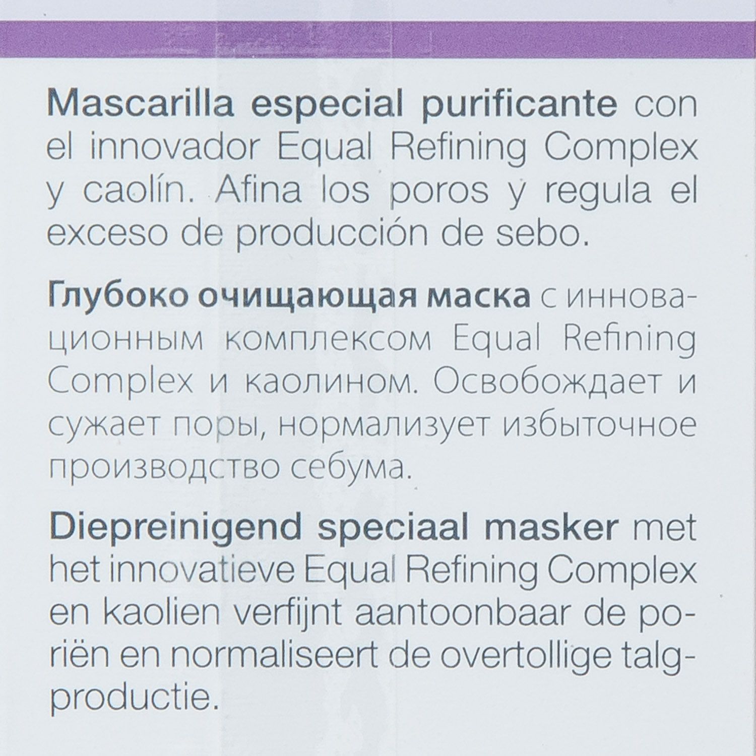 • Equal-Refining Complex (комбинация олеанолевой кислоты и экстракта из коры Enantia Chlorantha) подавляет активность фермента 5-альфа-редуктазы и снижает выработку кожного сала, уменьшая жирный блеск на 21,7% и размер пор на 16% через 28 дней применения