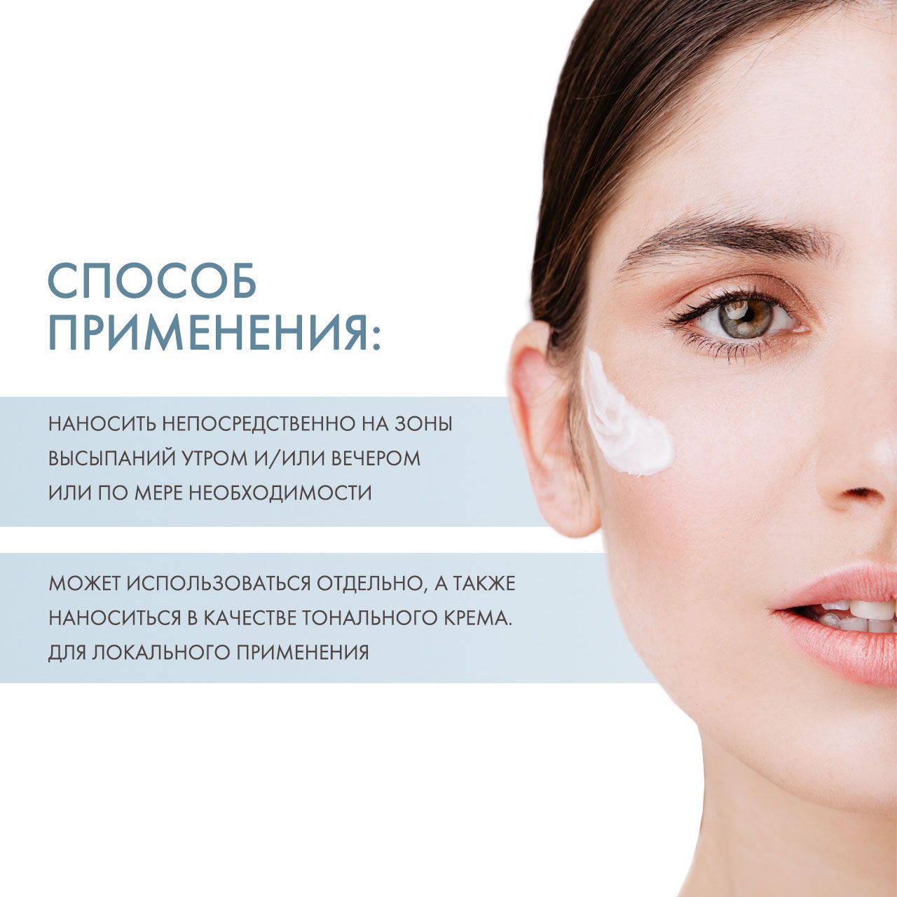 Наносить непосредственно на зоны высыпаний. Может использоваться отдельно, а также наноситься в качестве тонального крема.