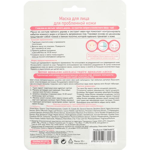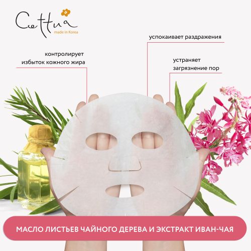 Маска для лица для проблемной кожи от Cettua- это маска с листьями чайного дерева, экстрактом кипрея узколистного (иван-чая). Масло из листьев чайного дерева и экстракт чайного дерева помогает контролировать избыток кожного жира и устранять загрязнение пор. Тканевая основа из целлюлозы представляет собой тонкое и мягкое полотно, которое идеально прилегает к коже. Содержит масло из листьев чайного дерева, экстракт иван-чая. Устраняет загрязнение пор и успокаивает кожу.