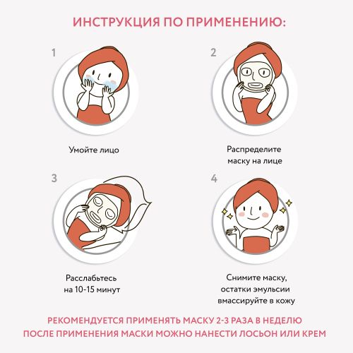 Тщательно очистите кожу и протрите насухо. Выньте маску из упаковки. Разверните ее и наложите на лицо. Примите удобное положение и расслабьтесь на 10-20 минут. Снимите маску и мягко вмассируйте остаток средства в кожу для того, чтобы сыворотка до конца впиталась. Излишки сыворотки можно нанести пальцами на кожду шеи. Меры предосторожности: Только для одноразового применения. Не использовать на раздраженной или поврежденной коже. Не засыпайте с маской на лице. Прекратить использование при появлении раздражания. В случае появления раздражения кожи во время использования маски, снимите маску и смойте ее большим количеством воды. Хранить в прохладном, недоступном для детей месте.
