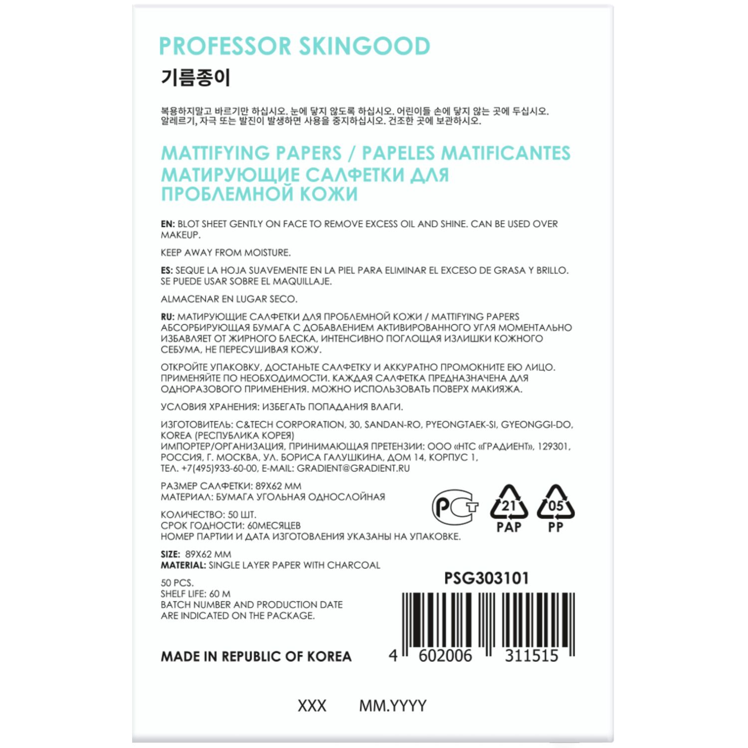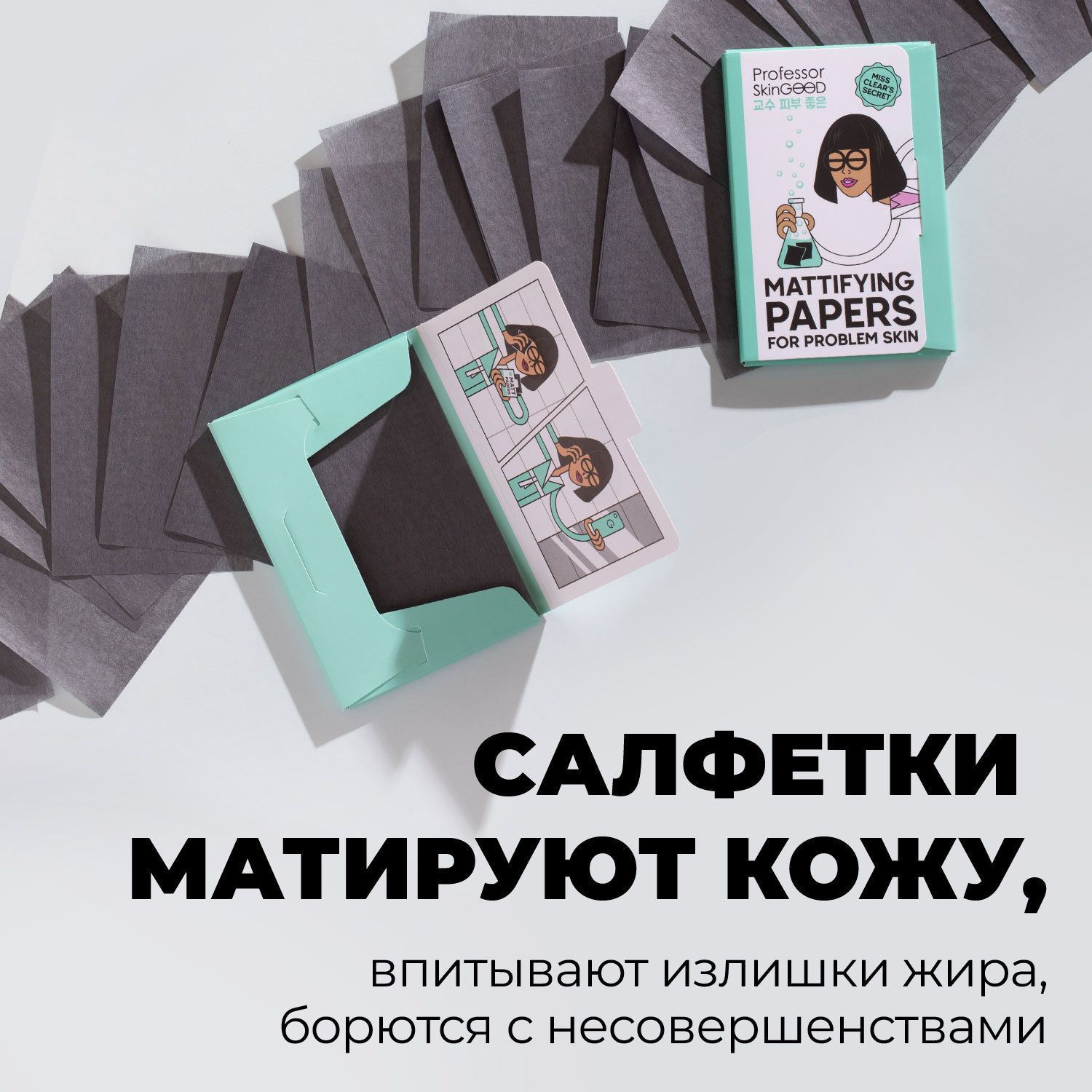 Абсорбирующая бумага матирующих салфеток для лица Mattifying Papers от Professor SkinGOOD (Профессор Скингуд) для проблемной кожи с добавлением активированного угля моментально избавляет от жирного блеска, интенсивно поглощая излишки кожного себума и не пересушивая. Подходит для ежедневного применения, для всех типов кожи, особенно для проблемной и жирной кожи.