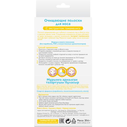 Очищающие полоски для носа предназначены для удаления грязи и жира, которые закупоривают поры в области носа. В состав полосок входит экстракт лесного ореха, который способствует сокращению пор во время и после использования очищающих полосок. Результат виден сразу после использования.
