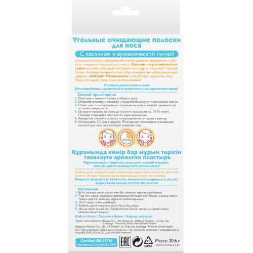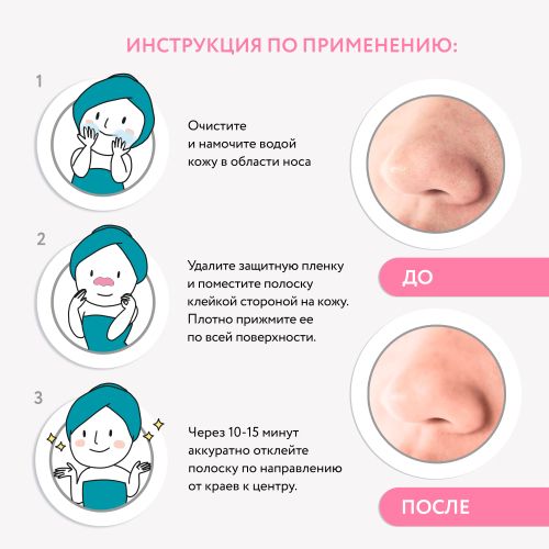 1. Очистите и намочите водой кожу в области носа. 2. Откройте упаковку и отделите полоску от пластиковой пленки. 3. Поместите очищающую полоску клейкой стороной на кожу в области носа и плотно прижмите ее для обеспечения полного контакта с кожей. 4. Оставьте полоску на коже на 10-15 минут. Полоска становится жесткой по мере высыхания. 5. После полного высыхания аккуратно отклейте полоску по направлению от краев к центру. Используйте 1-2 раза в неделю. Постоянное применение очищающих полосок способствует сужению пор.