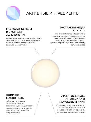 Состав: вода дистиллированная (aqua), гидролат березы (betula pendula leaf water), глицерин (glycerin), аллантоин (allantoin), инулин (inulin), ксантановая камедь (xantan gum), бензиловый спирт (benzyl alcohol), д-пантенол (panthenol), соль морская (maris sal), экстракт зеленого чая (camellia sinensis extract), экстракт кедра (pinus sibirica extract), экстракт хвоща (equisetum arvense extract), витамин е (tocopherol), эфирное масло розы (rosa gallica l. essential oil), эфирное масло апельсина (citrus aurantium essential oil), эфирное масло можжевельника (juniperus communis essential oil), этилгексилглицерин (ethylhexylglycerin)